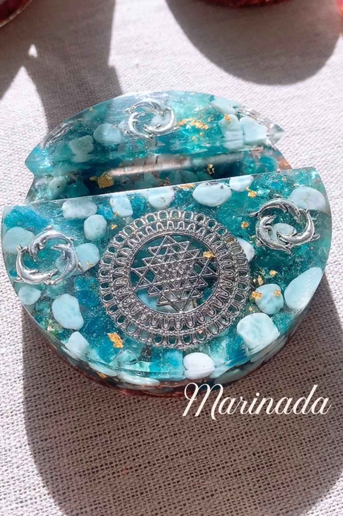水晶などの天然石や銅線、金属(銅チップなど)を有機物のレジン(樹脂)で固めて作製したもので、ネガティブなエネルギーをポジティブに変換するといわれています。